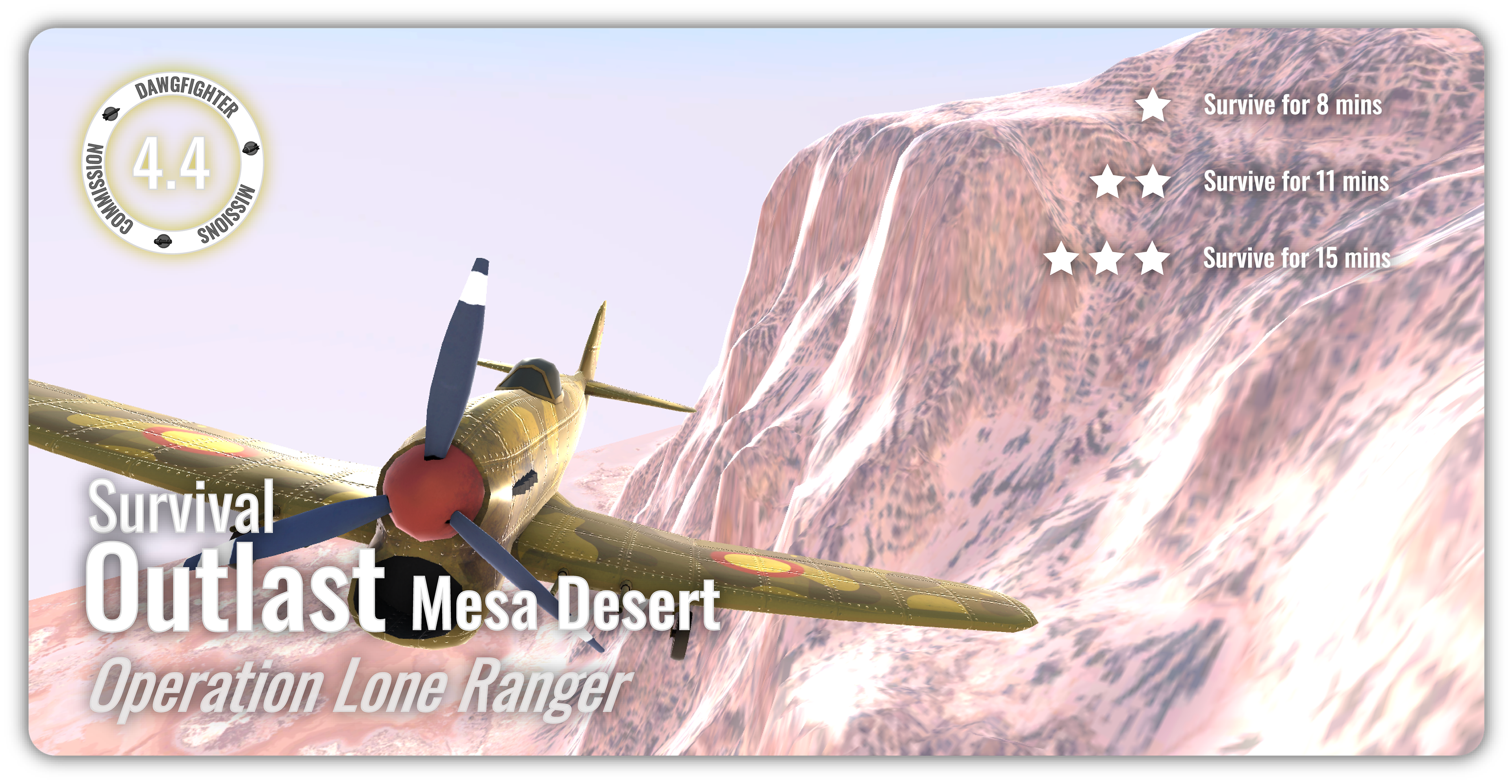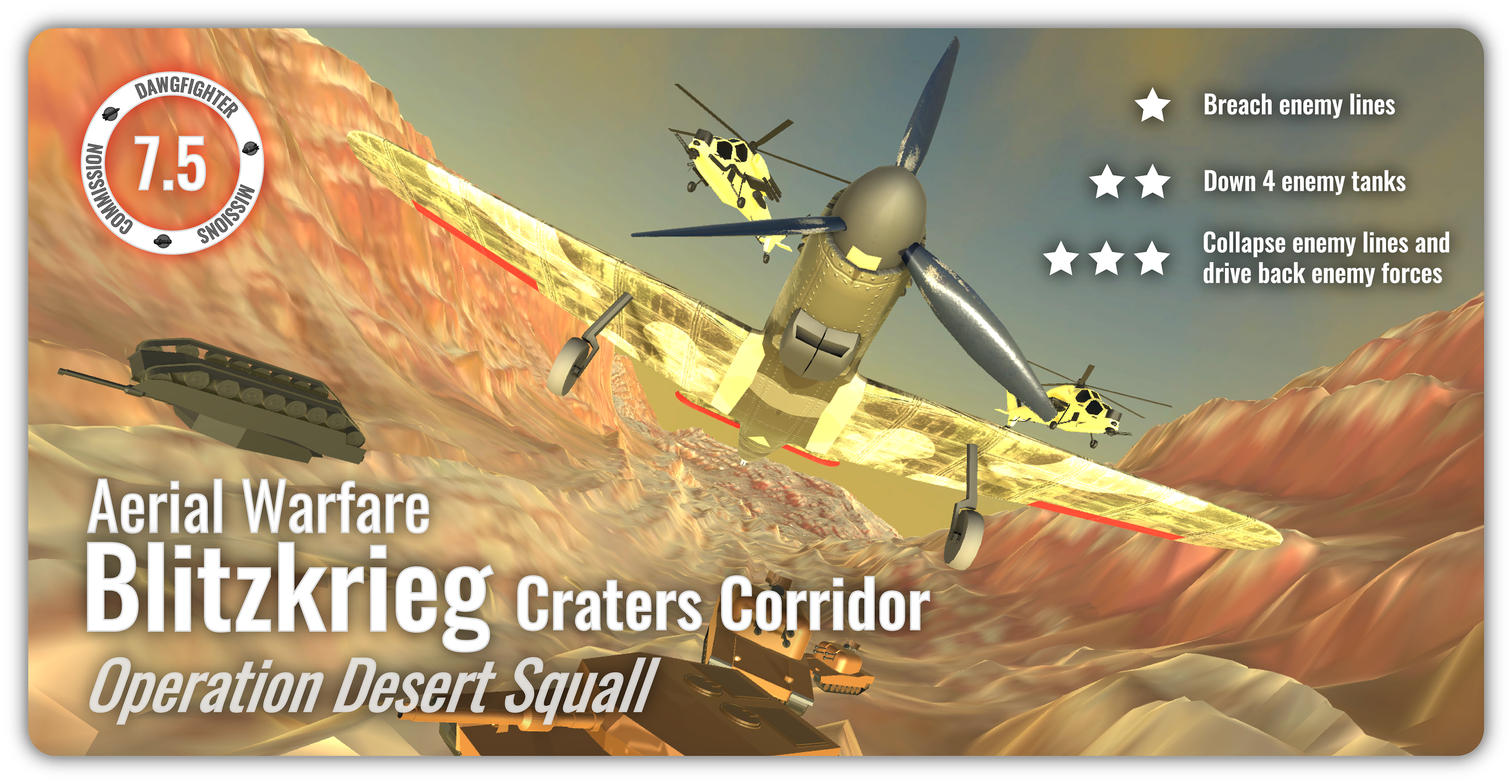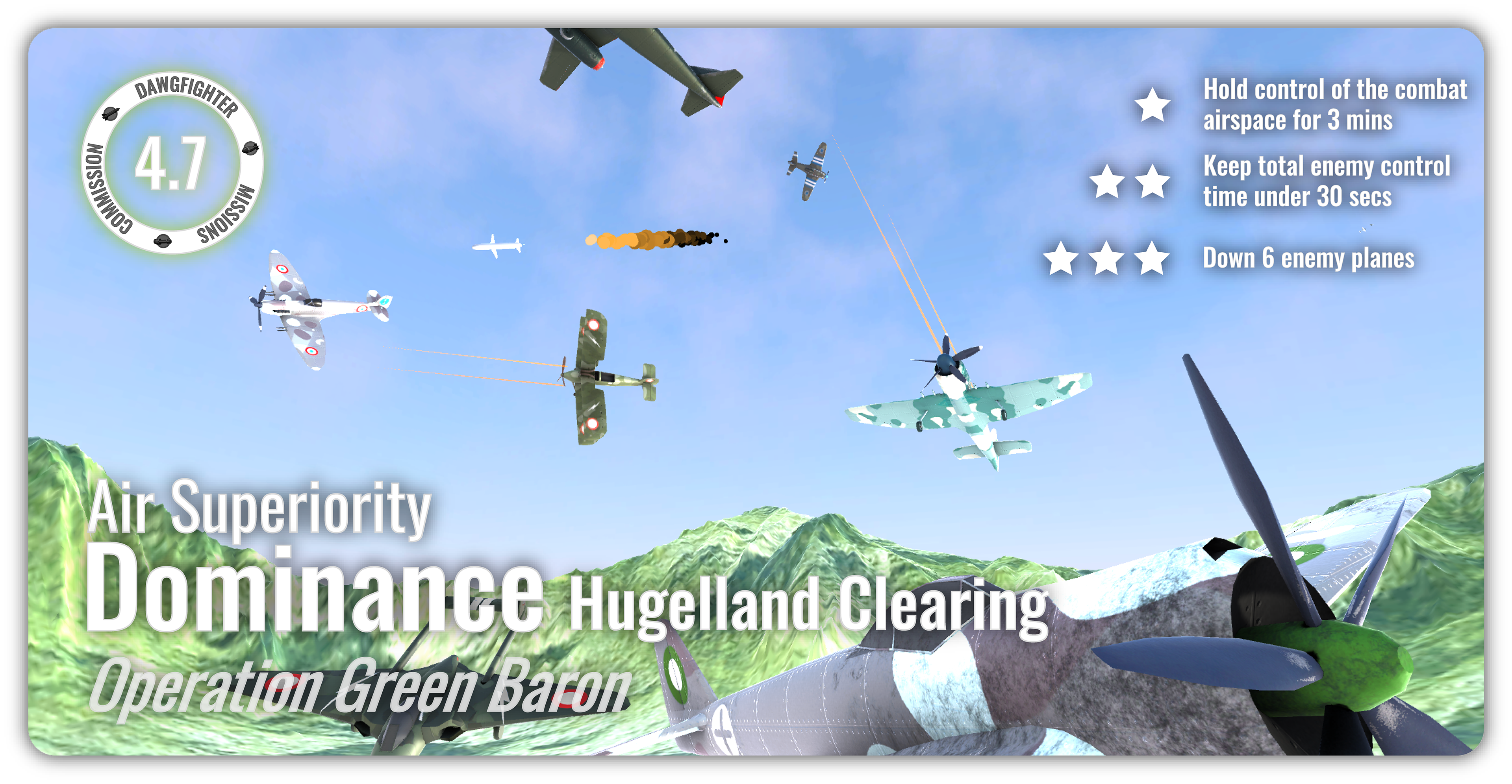 The asynchronous mode in Dawgfighters features mission-based gameplay across these maps, where players compete for the highest score while engaging alongside and against AI-controlled allies and enemies. The game currently includes seven missions with distinct objectives and difficulty levels, with additional content planned.