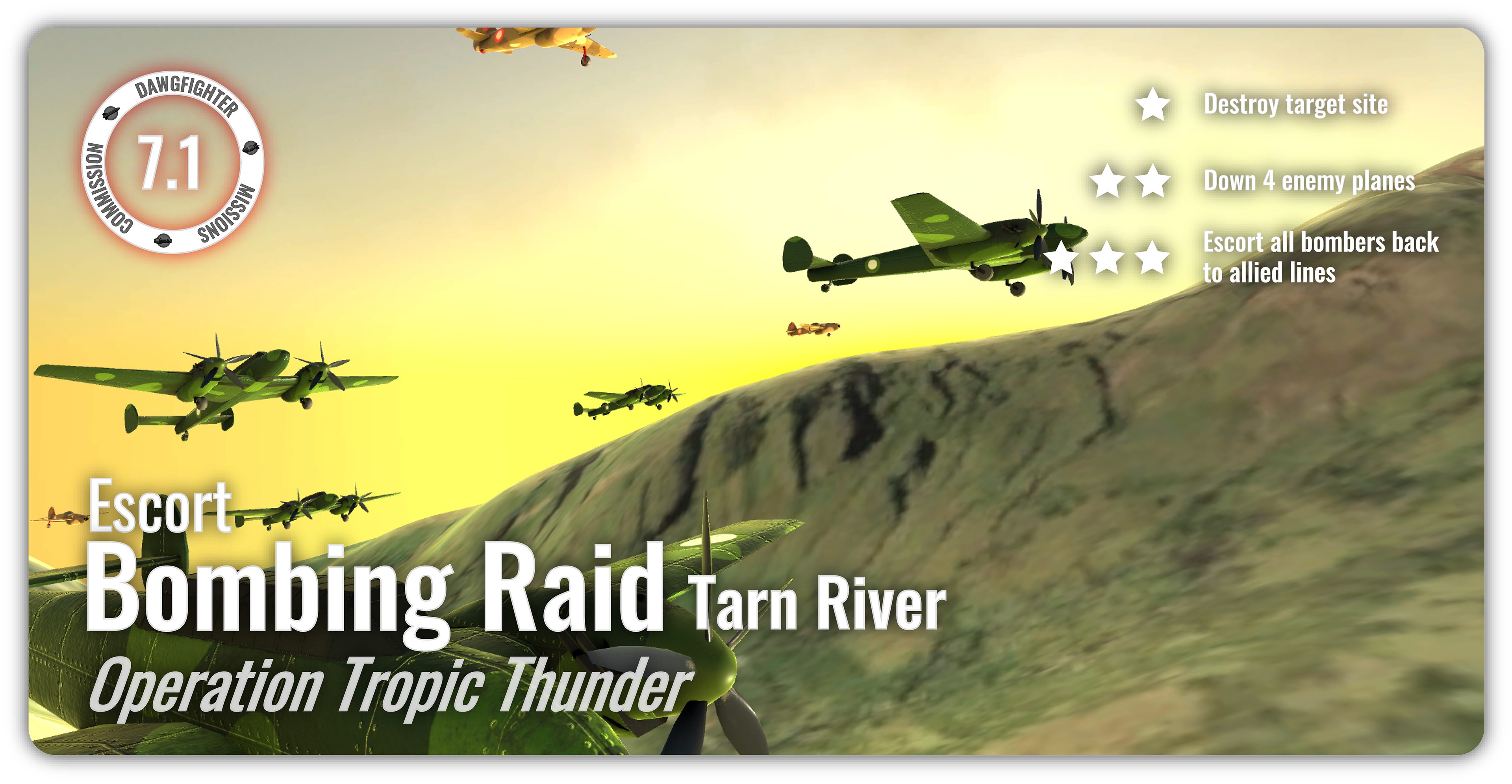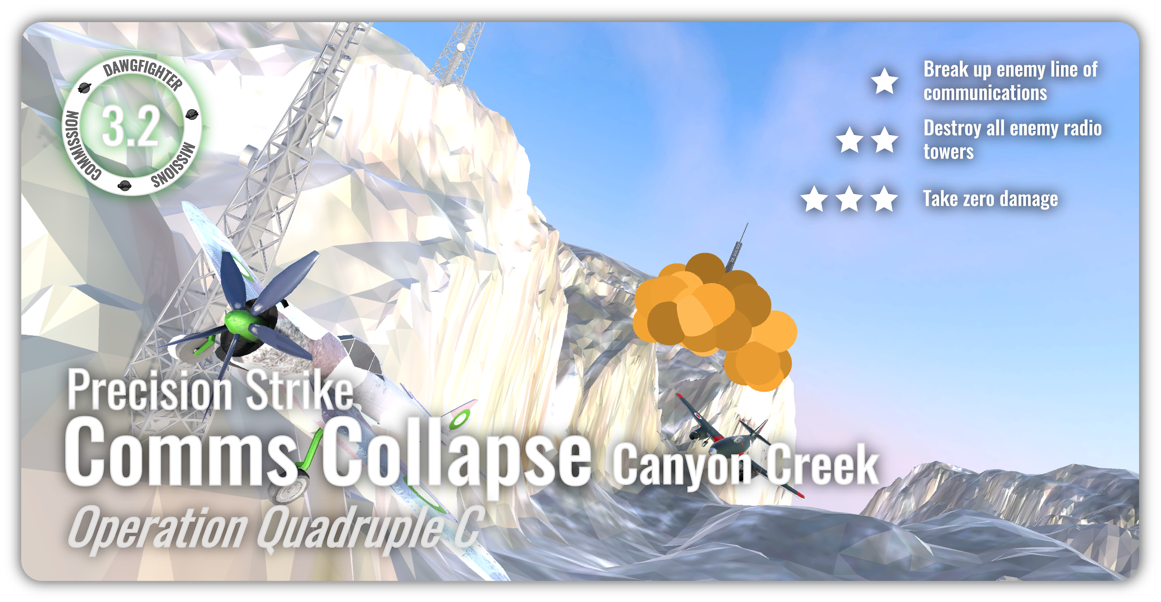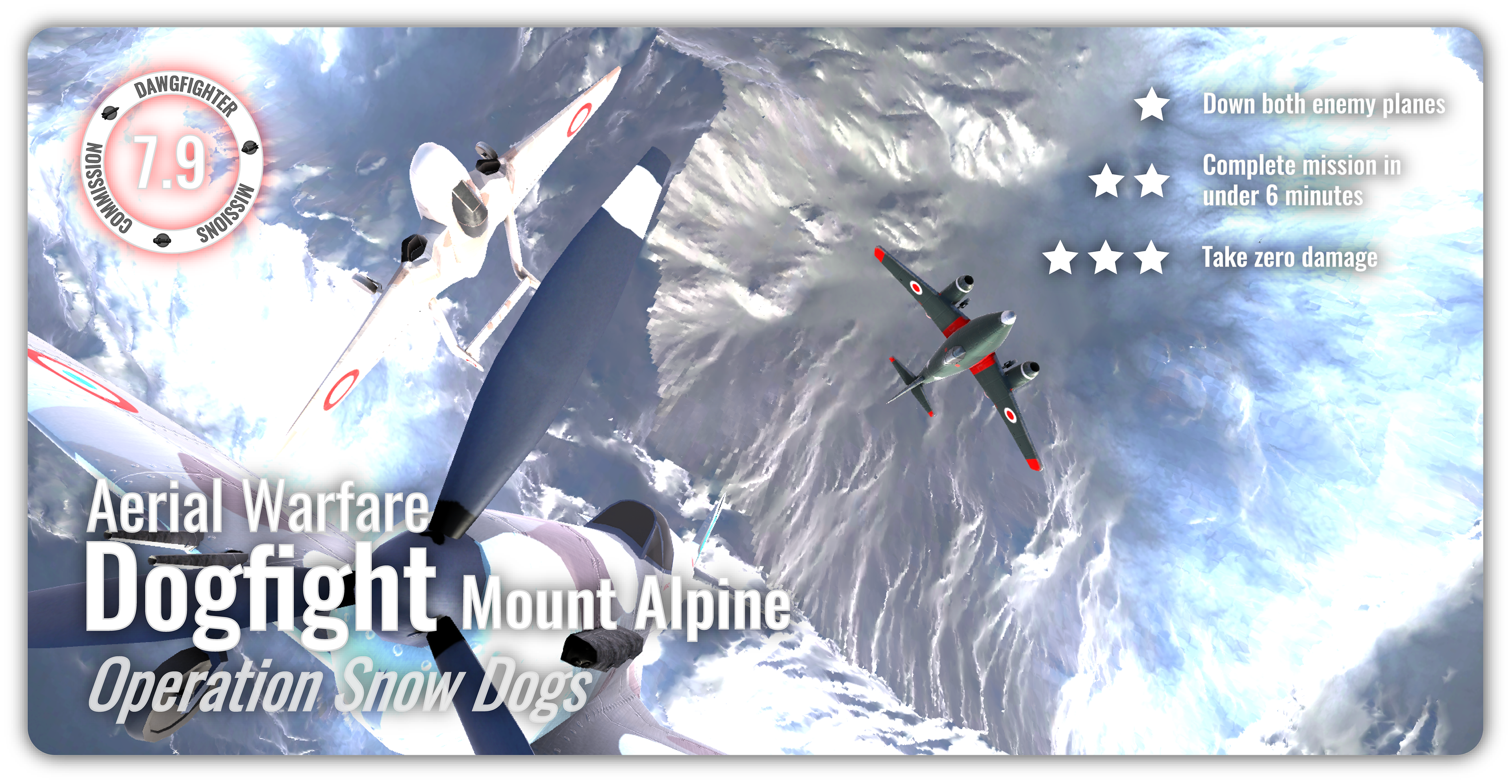 The asynchronous mode in Dawgfighters features mission-based gameplay across these maps, where players compete for the highest score while engaging alongside and against AI-controlled allies and enemies. The game currently includes seven missions with distinct objectives and difficulty levels, with additional content planned.