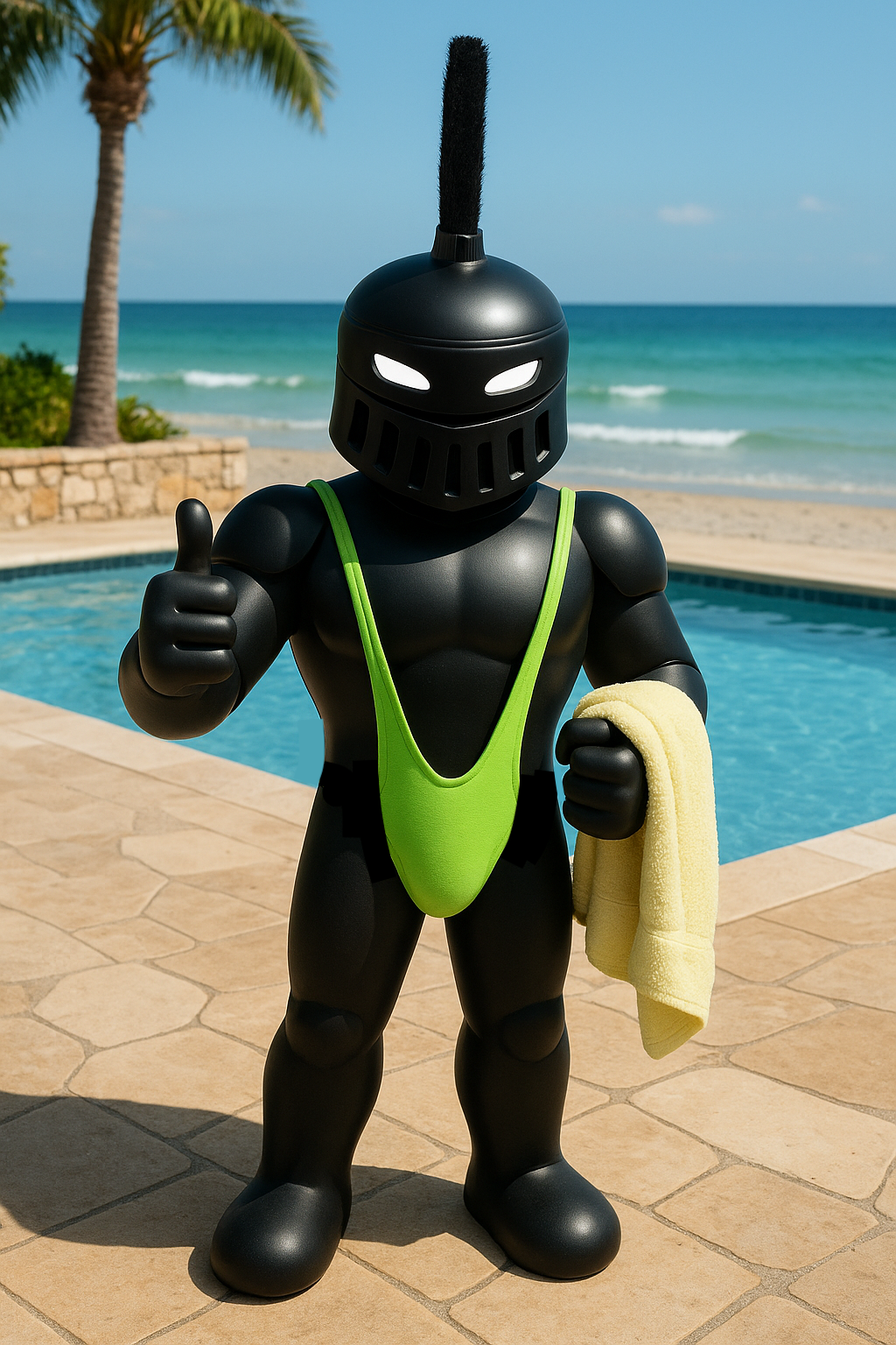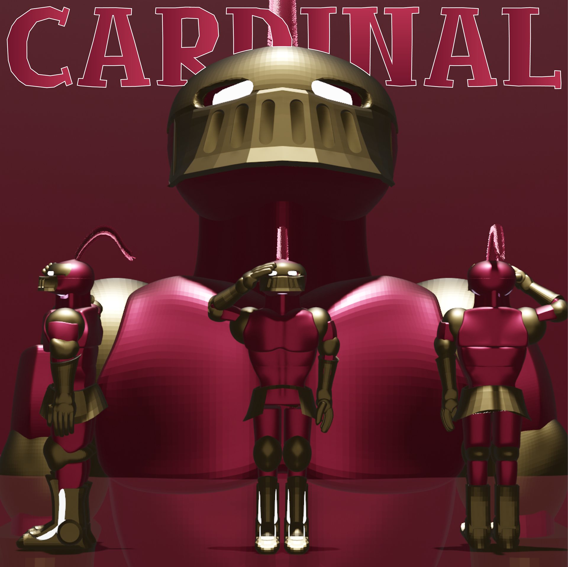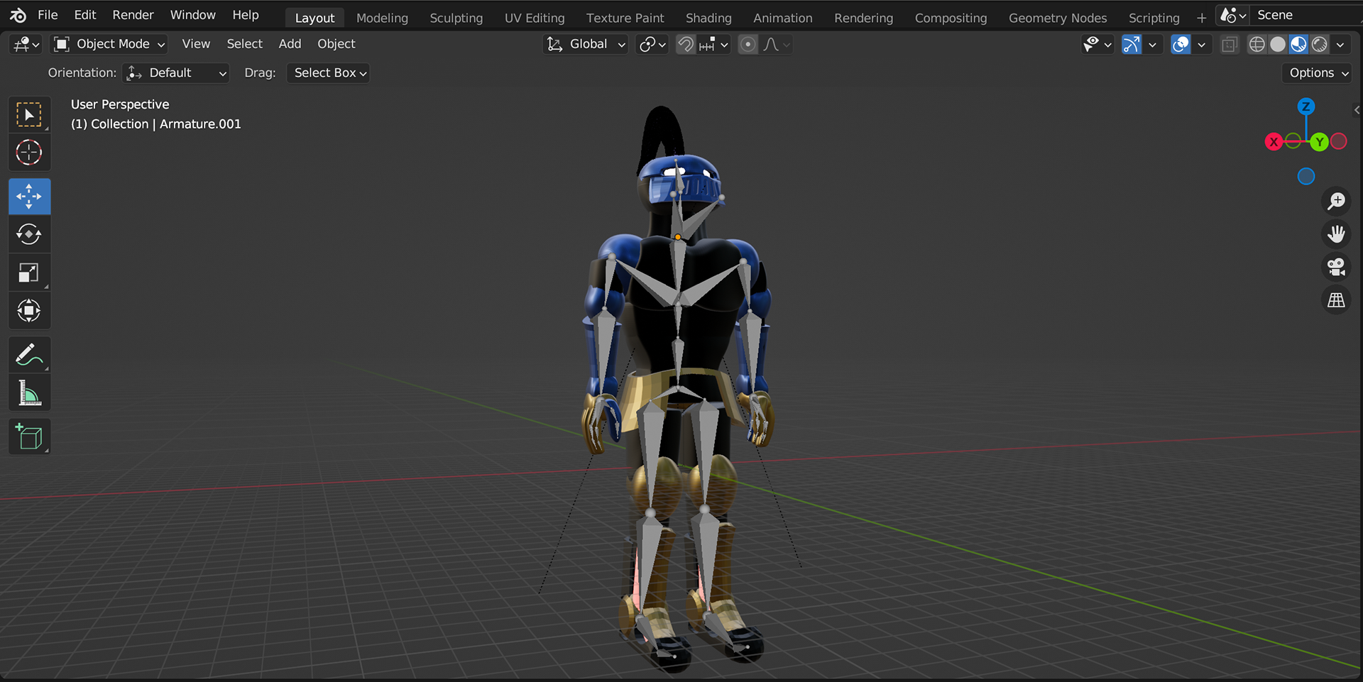 The Gnight blends futuristic elements with a retro video game aesthetic, standing as the symbolic guardian of our platform. Our goal was to create a robotic yet medieval looking sentinel, that gave the cool and hardened appearance needed in action and combat games, while still maintaining an overall identity of fun and approachability. The entirety of our mascot's design and modelling was completed in Blender. Pictured below is the 3D model of the Gnight with its animation rig visible, in Blender.